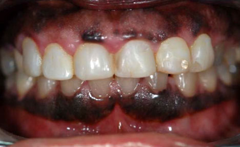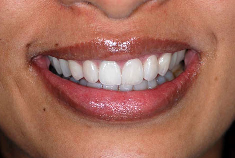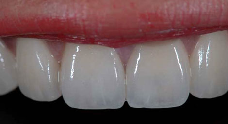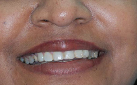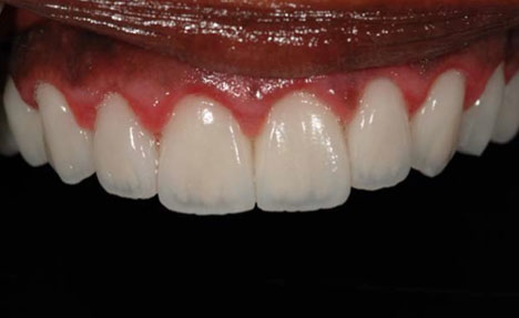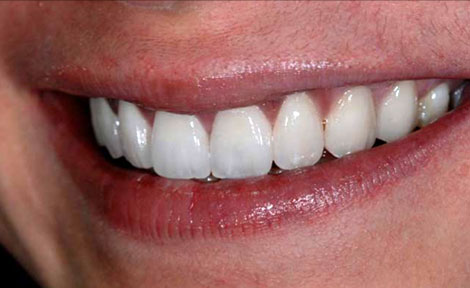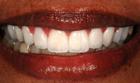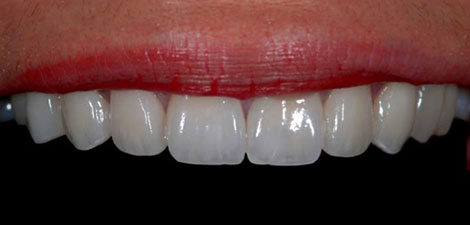 Using high aesthetic veneers, these teeth have been brightened, reshaped and even repositioned to create a youthful, harmonious smile. All this is achieved while maintaining a natural, realistic appearance. A combination of laser dentistry and precise designing allows gums that are healthy, uniformly coloured , well positioned and contoured. This is further set off and highlighted with high aesthetic veneers.